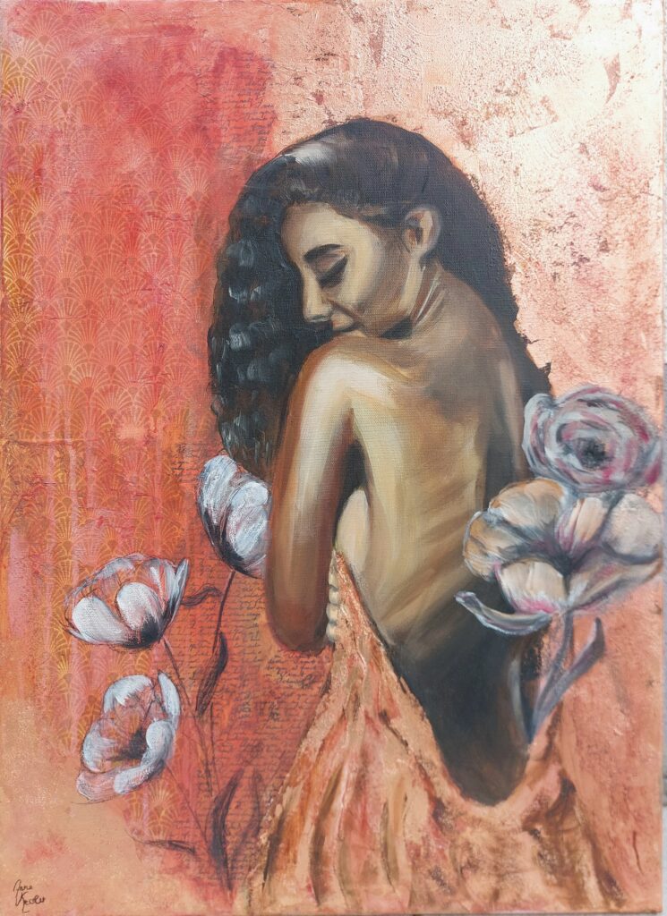 Eine Frau, nackt und verletzlich, kehrt sich sanft von der Welt ab – nicht aus Schwäche, sondern aus tiefer Selbstverbundenheit. Ihr Rücken, golden vom Licht des Selbstvertrauens, verschmilzt mit floralen Elementen, die wie Gedanken oder Erinnerungen um sie blühen. Das leuchtende Kupfer und die zarten Blautöne der Blumen stehen in kraftvollem Kontrast: Sinnlichkeit trifft auf seelische Stärke. Dieses Bild ist ein stiller Protest gegen äußere Erwartungen – und ein poetisches Ja zur inneren Wahrheit.